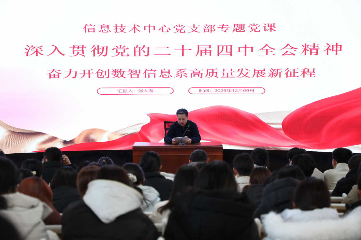 2025年12月9日,信息技术党支部书记刘大海为数智信息系全体师生讲授题为《深入贯彻党的二十届四中全会精神 奋力开创数智信息系高质量发展新征程》的专题党课。此次党课为深入学习贯彻党的二十届四中全会精神,锚定系部高质量发展目标,数智信息系师生齐聚一堂,共学全会精神、共谋发展新篇。